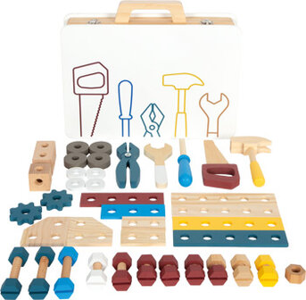 Alle mini-knutselaars opgelet! Met deze houten gereedschapsset kunnen kinderen een rollenspel spelen als doe-het-zelvers. De realistische accessoires en gereedschappen zoals een hamer, moersleutel, schroevendraaier, tang en zaag staan garant voor speelplezier en motiveren kinderen om creatief en met verbeelding te spelen. Met de vele verschillende accessoires zoals schroeven, moeren, tandwielen, een set ringen en geperforeerde stukken in verschillende vormen en maten kunnen kinderen hun eigen bouwprojecten maken met de bijgeleverde instructies.