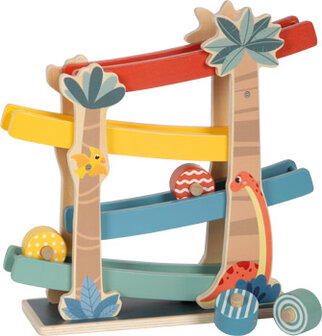 Snel door de prehistorische wereld van de dinosaurussen! Deze knikkerbaan van FSC® 100%-gecertificeerd hout brengt razendsnel speelplezier in de kinderkamer wanneer de vier gekleurde en gepatroneerde houten schijven over de vier hellingen racen. Deze robuuste racebaan heeft illustraties van twee schattige dinosaurussen en palmbomen en bladeren. Hij is bijzonder stevig met zijn brede basis!